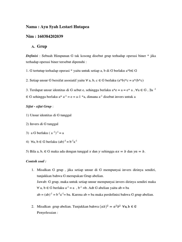 Penyelesaian soal latihan teori grup. Dalam struktur aljabar tidak perlu, bahkan tidak didefinisikan mengenai ujud. Struktur aljabar i (aljabar abstrak) sesuai dengan namanya. Himpunan s tertutup terhadap operasi *. Sistem aljabar (s, *) merupakan semigrup, jika.