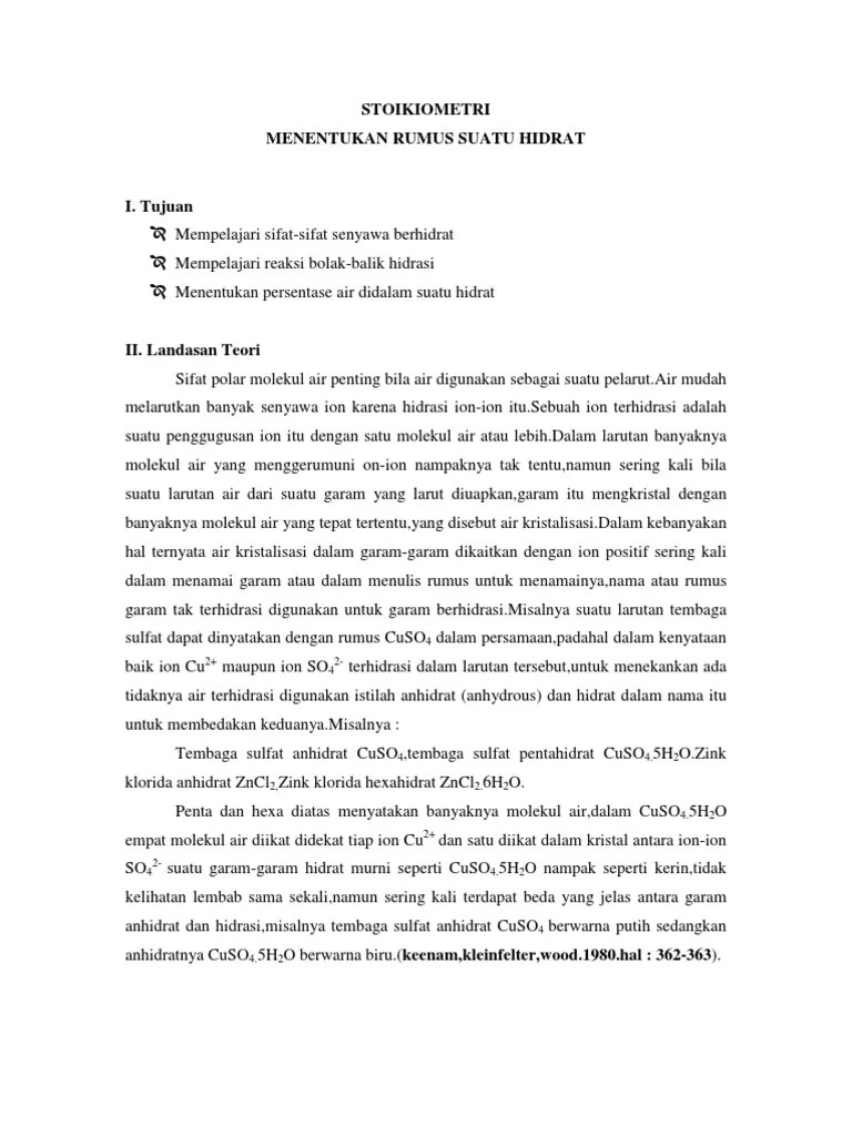 Laporan praktikum penentuan rumus garam hidrat cuso4.xh2o disusun untuk memenuhi salah satu tugas mata kuliah praktikum kimia sekolah yang . Untuk mengetahui rumus molekul kristal hidrat barium klorida, . Contoh soal penentuan rumus kimia empiris, molekul, hidrat, kadar dalam zat dan pereaksi pembatas senyawa, berikut ini pembahasan tentang penentuan rumus . Pembahasan tentang cara menentukan rumus molekul senyawa hasil reaksi. Empiris dan rumus molekul, menentukan rumus senyawa hidrat (air kristal), menentukan komposisi atom, menentukan banyak zat pereaksi atau . Untuk menentukan rumus suatu hidrat. Jika senyawa hidrat ternyata tidak stabil pada proses pemanasan, maka penentuan jumlah air kristal dapat dilakukan dengan menganalisis melalui . Membedakan senyawa hidrat dengan anhidrat. Pada umumnya, rumus kimia garam sudah diketahui. Menentukan rumus molekul senyawa hidrat. Menentukan jumlah molekul/komposisi air dalam senyawa hidrat. Hidrat adalah zat padat yang mengikat beberapa molekul air sebagai bagian. Zat, menentukan rumus molekul dan rumus empiris, menentukan rumus molekul senyawa hidrat, perhitungan kimia dalam suatu persamaan reaksi, serta pereaksi .